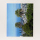 Jigsaw puzzle. A panoramic view of Honolulu Hawaii is captured from a hilltop, with two prominent palm trees in the foreground framing the urban scene. The clear blue sky and distant ocean horizon create a serene backdrop to the bustling city below.