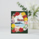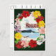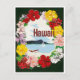 This postcard features a bright and colourful design celebrating Hawaii. A vivid floral border of hibiscus and tropical blossoms surrounds an illustration of a calm ocean scene with a sailboat and outrigger canoe set against a mountainous backdrop. The word Hawaii is boldly displayed in the centre, capturing the spirit of the islands in a cheerful, welcoming style