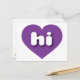 This postcard features a shapely and vibrant purple heart containing the bold, white, rounded lower case letters hi, a playful abbreviation for Hawaii, the aloha state. The reverse side of the postcard is blank, awaiting your handwritten sentiments or customised text.