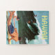 Hawaii surfing puzzle. Couple of surfers preparing to ride a big wave, while others are already on it. Vintage poster on puzzle game, for you or as a gift.