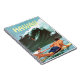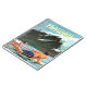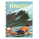 Hawaii surfing notebook. Couple of surfers preparing to ride a big wave, while others are already on it. Vintage poster on spiral notebook.