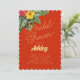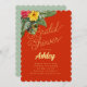 Tropical flowers and big leaves bridal shower invitations. Dark orange-red color with yellow text. Flowers and greenery decorate the upper left corner and the paper has a scalloped edge, which is optional.