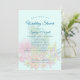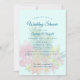 Tropical themed shower invitation for the bride and groom. Hawaiian flowers and pineapples designer couple's wedding shower invitation with custom templates. Blue wording in elegant script and modern printed fonts over a light blue background with big image of tropical flowers and two pineapples. Reverse has a pineapple pattern.