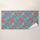 Colourful floral hibiscus flowers in pinks and orange with green leaves, Hawaiian inspired pattern on a blue background.