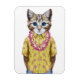 This design features a portrait of cat in a summer shirt and Hawaiian lei.
