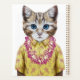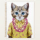 This design features a portrait of cat in a summer shirt and Hawaiian lei.