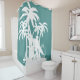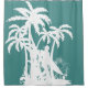 Tropical beach theme shower curtain design created with a palm trees and surfer silhouette on a teal green background. Hawaiian or Florida style scenic image that adds a touch of Polynesian design to your bath decor.