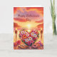 A romantic Hawaiian-themed postcard for Valentine's Day. The image features a beautiful Hawaiian beach at sunset, with vibrant orange and pink hues in the sky. The ocean is calm and reflects the sunset colours.