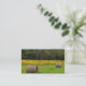This business card advertising hay for sale features a lovely autumn landscape. Summer is over and two bales of hay are drying in a green meadow bordering a field of brilliant yellow goldenrod. Next comes the woods. The trees are mostly green but some fall colours of red and yellow are starting to show. All text can be customised to fit your personal business needs.