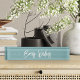 Elegant desk nameplate features your name, title, or choice of personalisation in white hand scripted cursive lettering on a dusty teal background.
