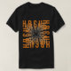 A dynamic t-shirt design featuring a swirling pattern of overlapping letters, primarily "H," "B," "C." and "U" The letters are arranged in a chaotic yet visually appealing manner, creating a sense of movement and energy. The use of contrasting shades of orange and grey adds depth and dimension to the design.
