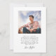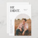 Modern graduation announcement card featuring a white arch frame for your photo. The text says "HE DID IT."