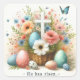 White cross in an easter basket, surrounded by foliage, flowers eggs and a butterfly.