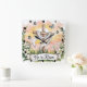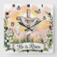 This inspiring square wall clock features a wooden cross draped with white cloth, set against a radiant sunrise and surrounded by vibrant white lilies and delicate blue butterflies. A banner with "He is Risen" in elegant script completes this serene and hopeful depiction of Easter and resurrection.