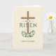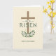 This card features a central wooden cross drawn with simple line details that suggest a rustic grain, set on a creamy off-white background for a calm, gentle look. Above the crossbar, the words “HE IS” sit in small dark gray letters, leaving airy space around them. The word “RISEN” appears larger in olive green, with several letters overlapping the vertical beam as if leaning in close, like a tender embrace. Beneath the base of the cross, a small wreath of white flowers with golden centers and fresh green leaves adds a soft spring touch 🌷. Tiny golden specks float around the floral ring, like warm glints catching the light. Along the bottom edge, “EASTER BLESSINGS” is placed in a neat sans-serif style in dark gray, centered and easy to read. The palette stays earthy and gentle, with the cross and lettering standing out clearly against the light background 🐇. The flowers form a loose circle with five-petal blooms and layered leaves, clustered just under the cross.