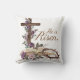 This Easter themed shirt has a pink and purple spring flower wreath borders along the edge. In the centre is a cross with a Bible and a spring floral bouquet with the verse "He is Risen."
