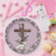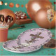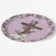 These Easter themed napkins have a pink and purple spring flower wreath borders along the edge on a bright lavender background. In the centre is a cross with a Lamb and a spring floral bouquet.
