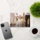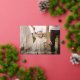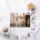 Elegant religious Easter card featuring your horizontal photo with "He is Risen" displayed in a gold foil calligraphy script. Personalise the front of the Easter photo card by adding a custom greeting, your name, and the year. The gold foil Easter card reverses to display a beautiful white floral pattern on a light blue background (background colour is editable).