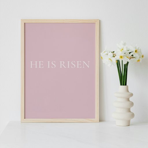 This soft lavender Christian wall art features the resurrection message “He Is Risen” in calm, refined typography designed for Easter reflection.