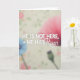 Designed with a soft-focus garden backdrop, this card pairs gentle spring colors with a tender, reverent mood 🌷. Creamy light fills the background while blurred hints of blush pink and leafy green drift like petals and stems in the distance. Centered in the middle, white uppercase text reads “HE IS NOT HERE, HE HAS” on the first line, with a small star icon just before the next line. Beneath it, “Risen” appears larger in flowing lettering, creating a graceful contrast to the firm, all-caps words above. The mix of crisp text over hazy florals feels like a quiet embrace between message and setting, as if the scene is leaning in close rather than shouting. In the upper right, a bright pink bloom glows softly, while a cooler blue flower shape rests on the left like a calm counterbalance 🐇. A small green bud sits near the lower right edge against the creamy background.