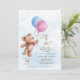 A cute, cuddly teddy bear holding onto a blue and pink balloon. Watercolor sky background. Whimsical, handwritten style fonts. Personalise the template with your own details. Use the Edit Tool to select different fonts or resize/reposition the design elements. © Kimbellished, LLC
