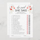 Get ready to add a touch of elegance to your summer or spring bridal shower with our 'He Said She Said' Red Watercolor Bridal Shower Game. This customisable wedding shower game card features stunning watercolor hand-painted red flowers and elegant calligraphy, making it the perfect addition to your celebration.
