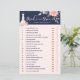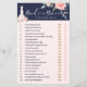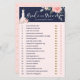 An elegant, stylish and trendy floral rose garden bridal shower he said she said bridal shower game. The design features our hand-painted chic, elegant and modern sheer white and pale blush pink wedding dress gown with a botanical garden of blooming roses and florals. The floral dress is hanging on an ornate vintage style faux gold dress hanger. Soft flower lace details and sparkling emblements on the wedding dress create a beautiful, sophisticated, and luxurious look. A beautiful script style handwriting typography "Bride Or Groom" in white. The navy blue, blush pink, and faux gold colour palette creates a trendy, shabby chic, and vintage style look. Watercolor floral roses frame the top. The reverse side features a minimalistic blush pale pink background with a gold heart pattern that beautifully complements the front artwork. Hand-drawn original artwork by Moodthology.