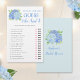 This bridal shower game is a He Said, She Said guess who said it game. It features watercolor blue hydrangea flowers. Personalise the back of the card with the bride's name. Matching products available.
