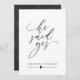 This save the date/engagement announcement features the phrase "He said yes" in a modern simple black handwritten script with details underneath and a black watercolor background on the back.