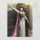 Vintage photograph of a young woman in a blue and pink costume with arm out and pointing.