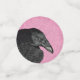 This table confetti has an illustration of the head and face of a black crow on various colours of purple, grey, and pink.