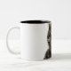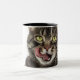 Head shot of a male domestic tabby cat licking Two-Tone coffee mug