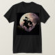 Shadowy form of headless rider on horseback brandishing guitar in front of a large, full moon.