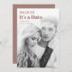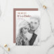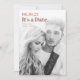 A modern typography based save the date design featuring a full bleed vertical or portrait orientated photo, with your wedding details aligned at the top. Your wedding date, "It's a Date," your names and wedding location appear in tonal taupe and terracotta lettering. Add additional details, like your wedding website, to the back.