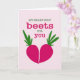 Anniversary Day card for your significant other. Front of the card has a pair of beets on a pale pink background and a cheesy fun pun that reads: "My Heart only Beets for You". Inside says "Happy Anniversary", but the message is editable for your personal message, and could also serve as an Valentine's Card.