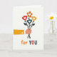 This design shows a stylized hand reaching in from the left, dressed in a golden-yellow sleeve with a white cuff, offering a bouquet that feels like a sweet, close-up gesture 🥰. Set on a bright white background, the bouquet sits centered so the hand and flowers become the whole focus, like a moment paused between two people. The blooms are mostly warm shades—deep red, marigold orange, and golden yellow—and each flower has a crisp white heart shape in its center ❤️. One navy-blue flower with the same white heart adds a cooler accent among the warm colors, with dark stems and small leaves keeping the arrangement grounded. The simple shapes and light texture make the bouquet look gently tactile, as if you could almost feel the paper cutouts. Near the bottom, the words “for YOU” are placed as a clear anchor, with “for” in orange and “YOU” in red and navy to match the flowers. The bouquet fans upward in rounded petals and heart centers, while the dark stems gather neatly toward the hand at the lower left.
