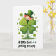 Designed with a bright white background, the card shows a cheerful leprechaun peeking from behind an oversized four-leaf clover, as if he’s sharing a secret with a close friend 💚. His wide grin, rosy cheeks, bright blue eyes, and orange hair sit under an emerald top hat with a shiny gold buckle, giving him a friendly, welcoming look. The giant clover takes center stage, with four heart-shaped leaves shaded from light lime to deep green, creating a soft, cushioned feel. Around it, smaller shamrocks float across the space like gentle confetti, adding a light sense of motion ☘️. A small patch of green grass at the base helps the clover and leprechaun feel grounded, like they’ve just popped up for a quick hello. Beneath the illustration, the phrase “A little luck is peeking your way” appears centered in dark green lettering, with a tiny shamrock used as a decorative star-like mark. The leprechaun’s sideways peek and the clover’s heart-like leaves together suggest a warm, friendly closeness without needing any extra fuss. The final detail is the tiny shamrock accent tucked into the text line below the scene.