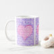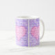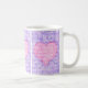 A pretty coffee mug for someone special with three panels containing a pink heart on a violet blue background. The words, 'I love you' are written all over the design in white lettering.