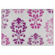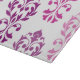 Leaf and scroll heart shaped damask with detail in pinks and plums on a white background in a off-set patterned print.