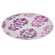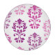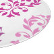 Leaf and scroll heart shaped damask with detail in pinks and plums on a white background in a off-set patterned print.