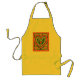 A golden yellow apron with a heart design in red, blue, green and gold from a watercolour painting by Judy Adamson