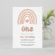 Cute girl First Birthday Invitation with a boho rainbow in muted pastel colours along with a pink heart in the middle. The header "One" along with the name of the birthday girl are in real rose gold foil. The backside has a pattern with the same rainbow as the front. This kids birthday invitation is shown for a first birthday party, but may be customised for any age.