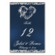 This romantic design features an elegant blue background with glitter borders, a heart and placeholders for the table number, couple's names and date of event. Available in several colours for your wedding theme. (Glitter is simulated in the artwork). Designed to coordinate with the Romantic Scroll Hearts & Glitter Wedding Collection. To change details, click «Personalise». To move the text or change the text size, font, or colour click «Click to customise further».