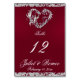 This romantic design features an elegant burgundy background with glitter borders, a heart and placeholders for the table number, couple's names and date of event. Available in several colours for your wedding theme. (Glitter is simulated in the artwork). Designed to coordinate with the Romantic Scroll Hearts & Glitter Wedding Collection. To change details, click «Personalise». To move the text or change the text size, font, or colour click «Click to customise further».