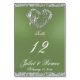 This romantic design features an elegant sage green background with glitter borders, a heart and placeholders for the table number, couple's names and date of event. Available in several colours for your wedding theme. (Glitter is simulated in the artwork). Designed to coordinate with the Romantic Scroll Hearts & Glitter Wedding Collection. To change details, click «Personalise». To move the text or change the text size, font, or colour click «Click to customise further».