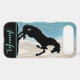 A blue and beige wavy background design with the black silhouette of a horse. Personalise with your name. Have different cases to fit your style or mood for the day! Designed by Robin Cox.