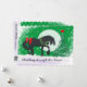 A beautiful silhouette of a black Friesian stallion with a holly wreath and a red bow on his tail. Your horse lover is sure to love this holiday themed card.