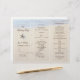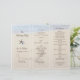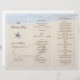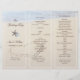 Heart in sand wedding program template. Fold in thirds to create a unique and beautiful beach theme wedding program. Easily customise using the template text lines provided. Two starfish decorated the front third which has four templates using brown text. Ocean water can be seen at the top lapping against the beach with a big heart drawn in the beach sand. This image will be printed on ONE SIDE ONLY. The reverse will be plain.