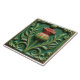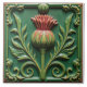 A square ceramic tile with a raised design of a thistle in the center, surrounded by stylized leaves and scrolls. The tile has a green background with the thistle flower in shades of red and green, and the leaves and scrolls are green with yellow highlights. The tile is framed by a thin brown border.