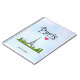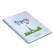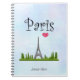 A personalised notebook with a whimsical drawing of the Eiffel Tower in the background surrounded by green trees. A pink heart and Paris typography add a girlish flair.